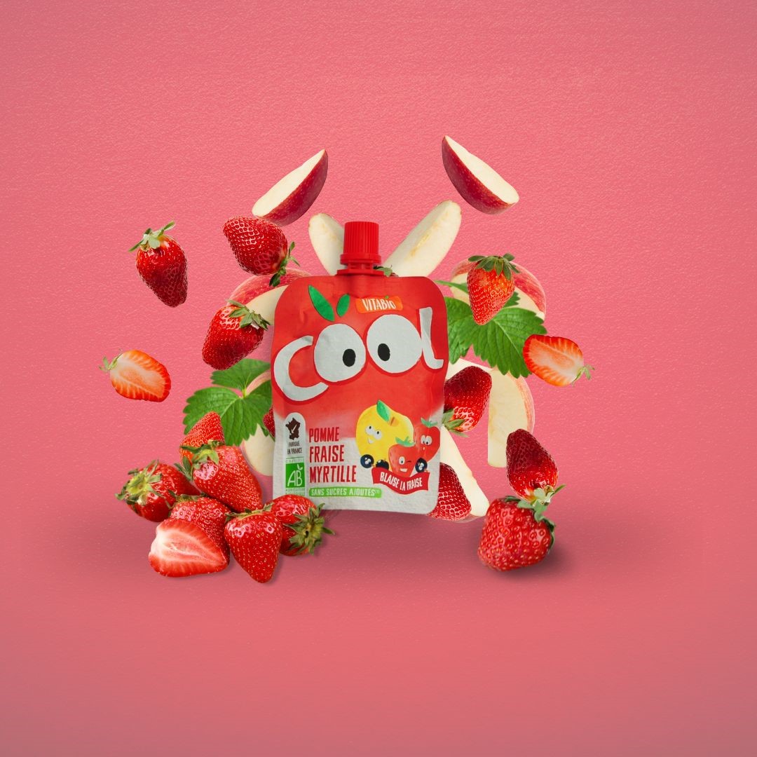 Pomme 69%, Fraise 25%, Myrtille 3%, Acérola 3%. Ingrédients issus de l’agriculture biologique