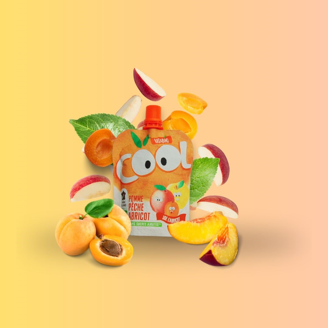 Pomme 67%, Pêche 20%, Abricot 10%, Acérola 3%. Ingrédients issus de l’agriculture biologique